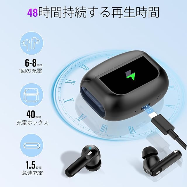 48時間再生:このブルートゥース イヤホン、1回の充電で6~8時間の使用が可能で、充電ケースを使用すれば48時間まで延長できます。ケースはわずか1.5時間でフル充電できるので、スポーツ、エンターテイメント、仕事、旅行、日常の活動など、あらゆるシーンで活躍します。さらに、スマート充電ケースはイヤホンとケースのバッテリー残量をリアルタイムで表示し、予期せぬ電源切れを防ぎます