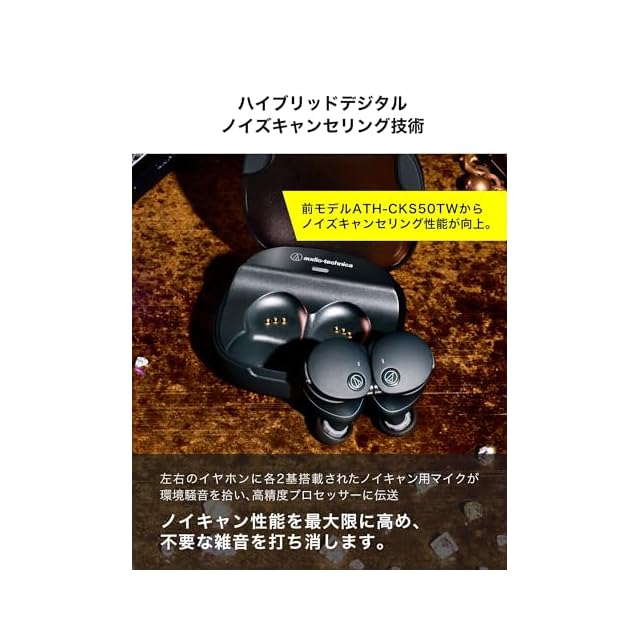 商品名:オーディオテクニカ ATH-CKS50TW2 BK(E) ワイヤレスイヤホン Bluetooth 5.3 ノイズキャンセリング 重低音 LE Audio対応 オリジナルステッカー付き マグネティックスイッチ機能 最大約65時間再生 IP55 防水防塵 マルチポイント対応 置き忘れアラート ヒアスルー 低遅延モード 急速充電 Qiワイヤレス充電対応 ブラック