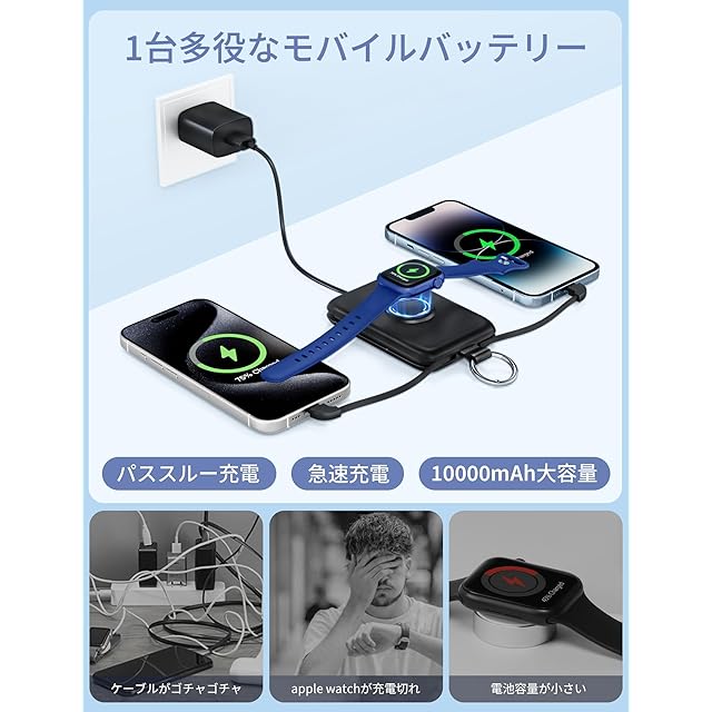 アップルウォッチ 充電 器 モバイルバッテリー ケーブル内蔵 10000mAh 大容量 タイプc iphone 充電器 軽量 小型 携帯充電器 持ち運び for apple watch モバイル充電器 防災グッズ