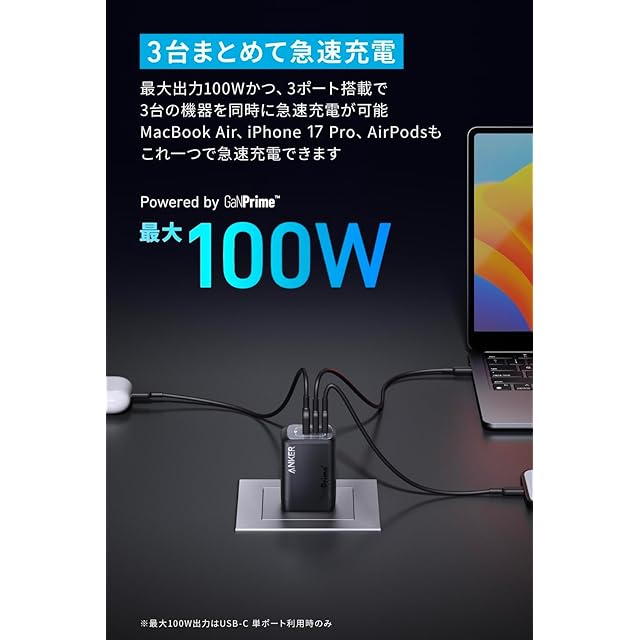 3台まとめて急速充電:最大出力100Wかつ、3ポート搭載で3台の機器を同時に充電が可能。MacBook Air、iPhone 17、AirPodsもこれ1つで充電ができます。