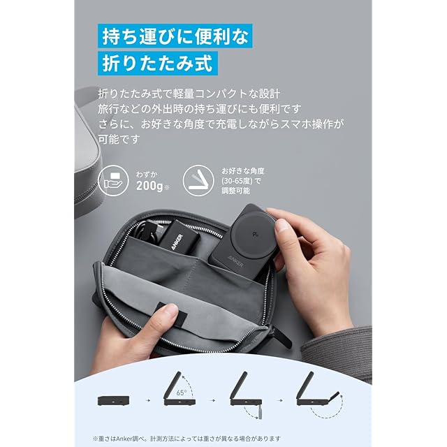 持ち運びに便利な折りたたみ式:折りたたみ式で軽量コンパクトな設計 旅行などの外出時の持ち運びにも便利です。さらに、お好きな角度で充電しながらスマホ操作が可能です。