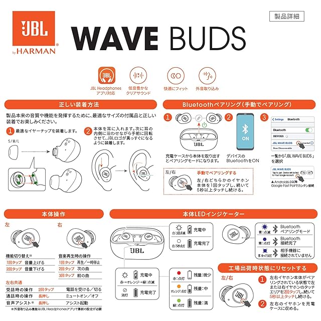 商品名:JBL WAVE BUDS 完全ワイヤレスイヤホン Bluetooth/IP54防水防塵/アプリ対応USBタイプC/ホワイト JBLWBUDSWHT 小