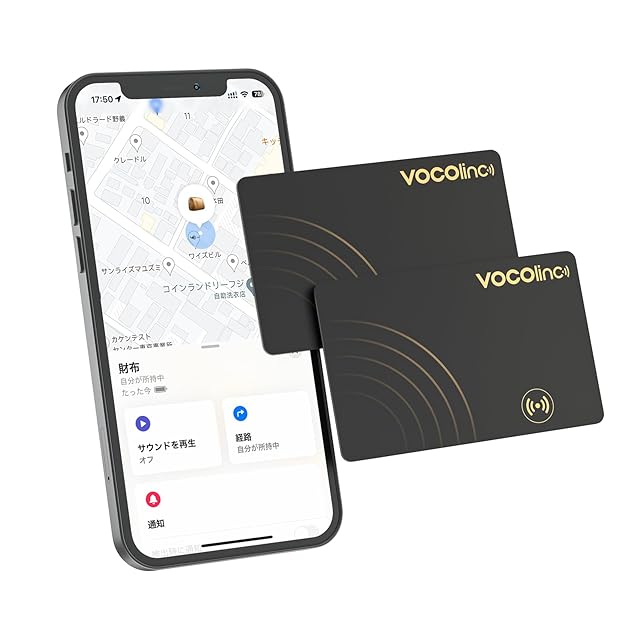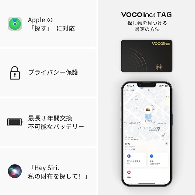 <b>「スマートタグ」―VOCOlinc </b><br>・対応機種: iPhone・iPadに対応(iOS14.5以上システムに全部対応できる 財布 エアタグ カードです。<br>・ サイズ:85.5* 54*1.6mm <br>・重量:12g <br>・ 付属品:本体*1,電池(内蔵)*1,説明書*1 <br>機能性:<br>リマインダーの忘れ物 <br>Appleの「探す」アプリで「忘れ物通知」をオンにします。スマホから「呼び出す」のコマンドを送信したら、レシーバーが大きい80dB+ビープ音を鳴らして振動します。音に追跡して迅速に紛失したアイテムを見つけられます。 <br>アイテムが放棄され、AppleデバイスのBluetoothから切断された場合、Appleの「探す」」アプリがすぐに追加費用なしで通知を送信します。<br>過去の位置情報<br>Bluetoothの圏外では、アプリ「探す」がVOCOlincタグの履歴位置をマークするので、その場所に戻って地図から紛失物を見つけることができます。<br>IP67の耐水性<br>3000回以上のテストにより、汗、水、雨に強いです。<br>交換電池不可能<br>★内蔵電池の寿命は3年です。