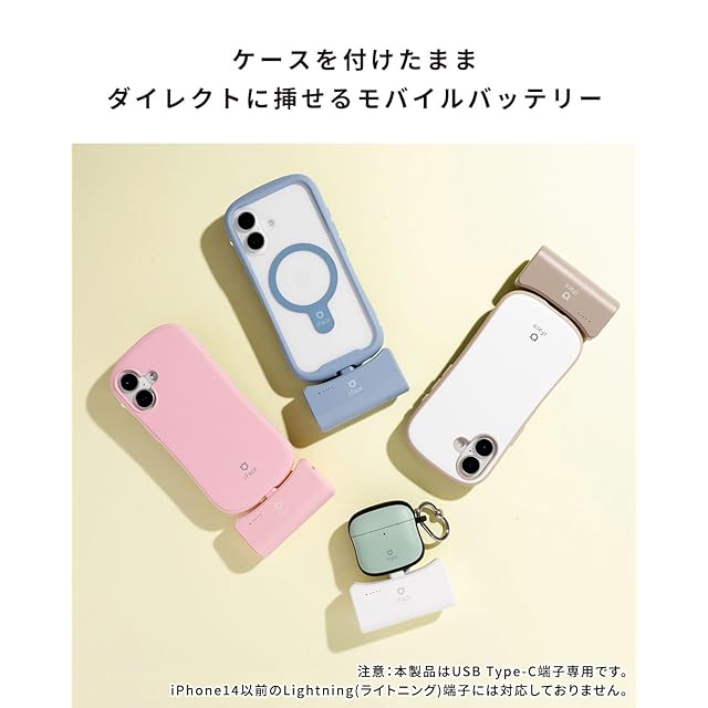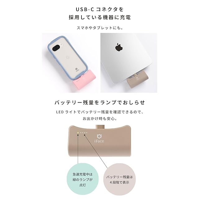 ケーブルレス充電だから、ストレスフリー!<br>持ち歩きやすい、コンパクトタイプ<br><br>iFaceケースにピッタリ合うように設計されているため、スマートにスマホの充電が可能です。<br>スマホの充電がなくなってきたらサッと挿して充電。ケーブルレスなので使用中にケーブルが邪魔になることもありません。<br><br><br>・iFaceケースのカーブラインに合わせた長めのコネクタと専用ラウンド設計<br>・外出先でも安心の容量5000mAhのリチウムバッテリー(iPhone 16の場合は約0.7回の充電可能)<br>・充電しながらスマホを使用できる<br>・入出力コネクタを搭載し、ケーブルなしで給電・充電が可能<br>・最大出力PD20Wで、タブレットの充電にも対応 ※タブレットにケース装着時は充電不可 ※PDはUSB Power Delivery規格の略称です<br>・PD3.0規格、QC3.0規格を搭載しているので幅広い機器に急速充電が可能 ※QCはQuickCharge3.0規格の略称です<br>・2台同時充電可能 ※最大電流の制限により充電時間が長くなる場合があります<br>・小さいバッグやポケットにも収納できて、持ち運びしやすい<br>・ストラップホール付き ※ストラップを付けカバンなどからぶら下げないでください<br>・保護回路搭載の安全設計(過電流防止機能・短絡保護機能・温度検知機能、過充電保護、過放電保護)<br>・急速充電モードが一目でわかるLEDランプ搭載<br>・バッテリー残量を4段階で表示<br>・持ち運び時にコネクタを保護するシリコンキャップ付き<br>・シリコンキャップは本体にくっついているので紛失の心配なし<br>・表面はさらりとしたマット加工<br><br><br>商品仕様<br>商品サイズ:約縦5.0×横7.9×厚2.5cm、重量約97g<br>内蔵電池:リチウムイオン電池<br>放電サイクル:約500回<br>電池容量:3.7V/5,000mAh<br>定格容量:2,600mAh(5V)<br>蓄電時間:約2時間<br>入力:USB-C(C1,C2) 5V/2.4A、9V/2A、12V/1.5A<br>出力:USB-C (C1,C2) 5V/3A、9V/2.2A 、12V/1.67A (最大PD20W)<br>C1C2同時出力:5V/3A(最大15W)<br>C1:入出力コネクタ、C2:入出力ポート<br>付属品:USB-C to USB-Cケーブル(約30cm)<br>:有(1年)<br><br>ご購入時の注意<br>※USB-C端子専用の充電器です。それ以外の端子にはご利用いただけません。<br>※タブレットなどの大型端末や充電口付近が特殊な形状のケースをご使用の場合、充電器が干渉しご利用いただけない場合があります。