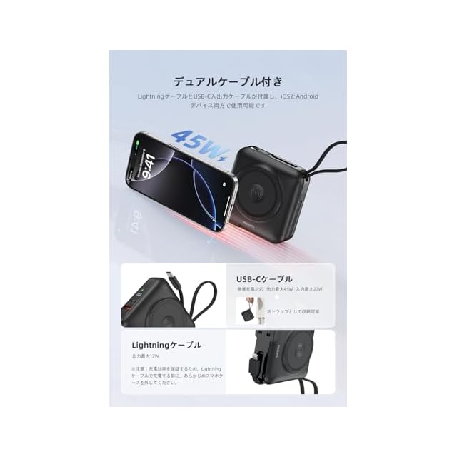 【急速充電!最大出力PD 45W】 USB-CケーブルとポートはQC2.0/QC3.0/AFC/FCP/PD3.0/PPSなどの協議を対応されております。最大15V/3A(45W)と20V/2.25A(45W)でフルスピード充電技術によって急速充電も可能で、スマホのバッテリーが切れたとしても短時間でしっかり充電できます。災害などの緊急時・会議の時・アウトドアなど、コンセントのない場所でスマホやパソコンの充電に大活躍すること間違いなし!※注意:充電効率をするため、lightningケーブルで充電する前に、あらかじめスマホケースを外してください。