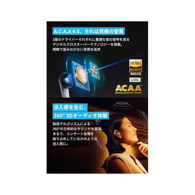 A.C.A.A 4.0による究極の音質:低音域用と中高音域用のアップグレードされた2基ドライバーを搭載。それぞれのドライバーに最適な音の信号を送る技術により、高音から低音まで明瞭で歪みの少ない音質を追求しました。