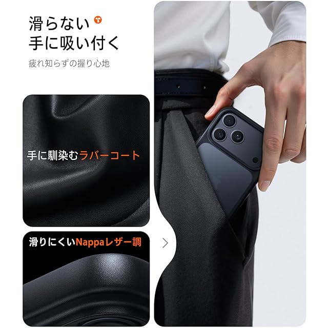 【防滑と快適さの完成形、7年の進化】NaPPaレザー調の微細なテクスチャーとラバー塗装を組み合わせ、手に自然に馴染む防滑性を実現。サラサラで滑らか、高級マウスのような上質な手触り。7年間の改良の末に辿り着いた、滑りにくさと心地よさの究極バランスです。手に握った瞬間から安心感と満足感が広がり、長時間の操作や持ち歩きでも疲れにくく、滑り落ちの不安から解放されます。(対応機種:For いPhone17pro ケース)