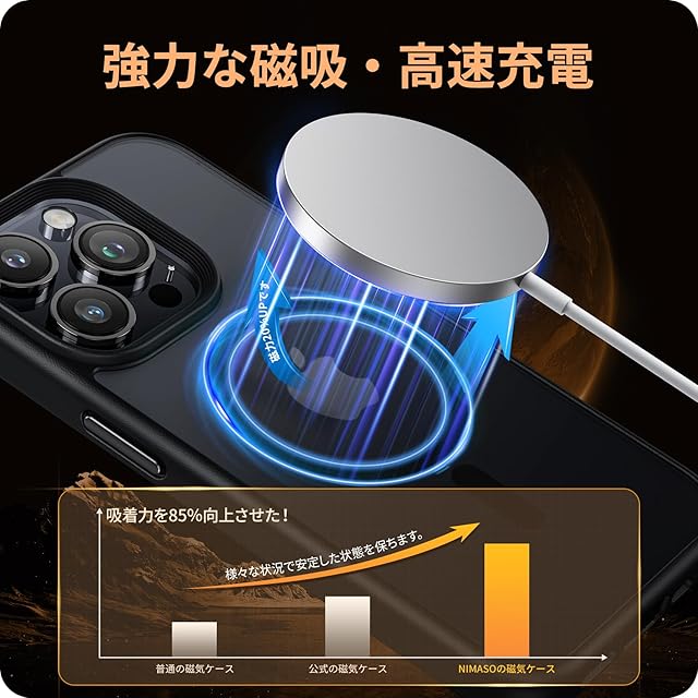 【MagSafe対応・強力な磁吸】スマホケース内部に38個の強力なN52マグネットを搭載しており、一瞬でピッタリと高速充電を実現!いくら振っても落ちないので、充電しながらゲームをやっても問題なし!また、ワイヤレス充電やモバイルバッテリー・車載ホルダー・スタンド・リングなど全てのMagSafeアクセサリーにもばっちり対応しています。