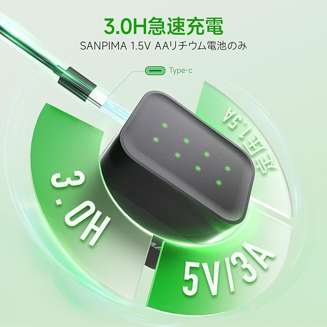 商品名:SANPIMA 単3形リチウム充電池8本 1.5V 大容量3600mWh/2400mAh 急速充電器付き 約1600回充電可能 1-8本同時充電 3時間充電 自然放電抑制