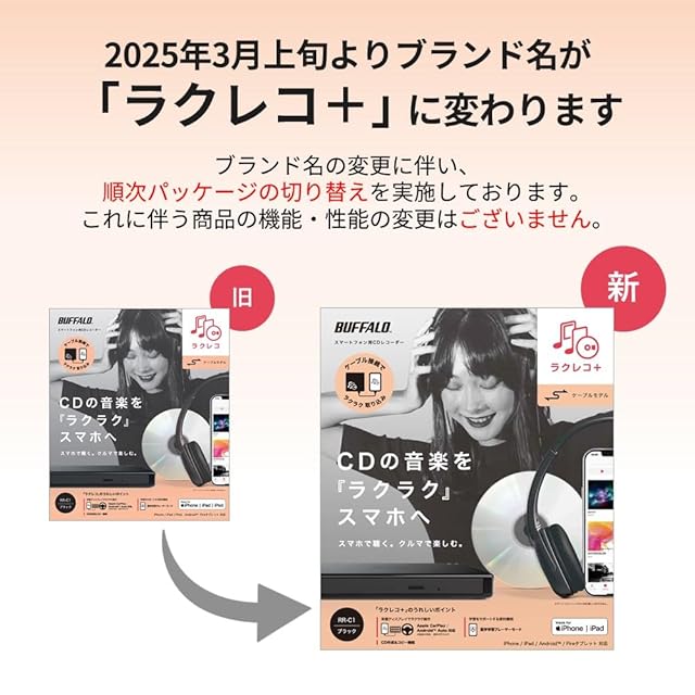 商品名:バッファロー ラクレコ+ iPhone スマホ CD 取り込み CDレコーダー 語学 学習 プレーヤー パソコン不要 ケーブルモデル 【 iOS ・ Android/iPad/Fireタブレット 対応 】 ブラック RR-C1-BK/N