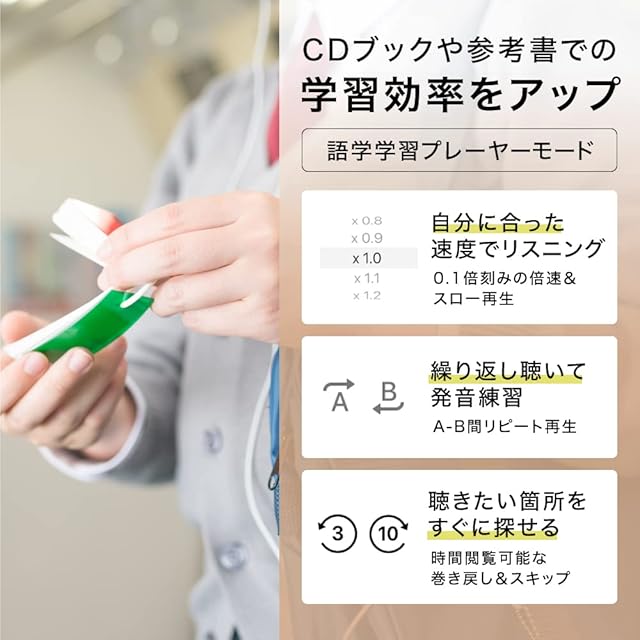 【パソコン不要!CDがスマホですぐ聴ける】パソコンの起動やパソコンから曲をスマホに転送する時間がかからないのでCDの楽曲をスマホでかんたんに楽しめる。【いつでも・どこでも】スマホの中に楽曲が保存されるから外出先でも自由に聴ける。再生モードを切り替えれば、倍速再生やリピート再生で語学学習にも便利。