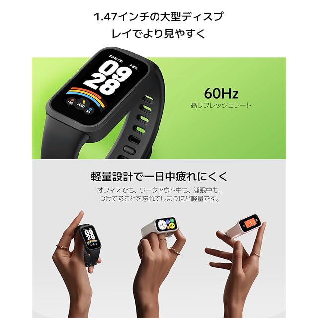 【1.47インチの液晶ディスプレイと9.99mmの薄型軽量設計】1.47インチの大型液晶ディスプレイを採用。表示領域が大きいため、より多くの機能、情報、コンテンツを見やすく表示できます。また、軽量でスリムな9.99mmボディであるため、仕事や運動、睡眠のあらゆるシーンで付けていることを感じさせず、快適な装着感を提供します。