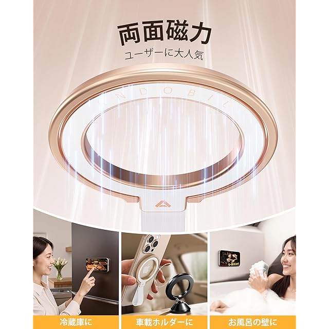 【ユーザーに大人気・両面マグネット機能】当社の製品MagRing Proは、その両面マグネット機能がユーザーに大変好評をいただいており、MagStand Proでも同様の機能を引き継いでいます。お客様は両面磁気吸着機能を使用して、車載ホルダーや冷蔵庫、洗濯機、ジムの設備など、磁力のあるものに製品を取り付けることができます。また、キッチンやお風呂の壁など磁力のないものには、付属のメタルリングを貼り付けることで磁力を持たせることも可能です。この両面マグネットで、いつでもどこでも両手を解放して、TikTokやYouTube、Instagramなどのアプリを自由に楽しむことができます。