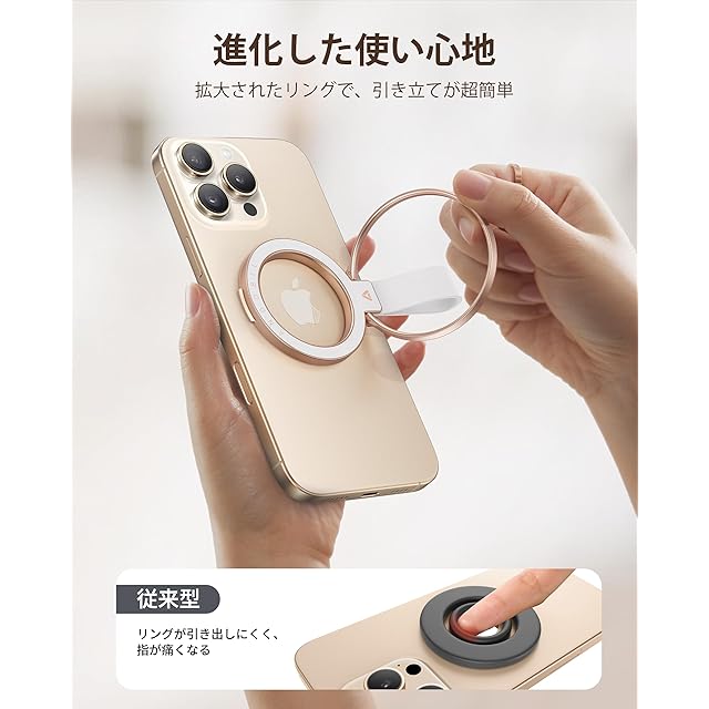 【超快適・超便利・耐久性抜群・汚れ防止のシリコンバンド】もしお客様のスマホがiPhone 16シリーズであれば、このスマホリングは最適な選択です。このスマホリングのシリコンバンドはiPhone 16のカメラコントロール機能に対応しています。iPhone 16のカメラコントロールボタンはスマホ下部にあるため、片手操作が少し難しいですが、シリコンバンドは指をしっかりフィットし、ボタンを楽に操作でき、素晴らしい写真や動画を撮ることができます。さらに、他の機種をご利用の場合でも、このスマホリングは同様に最適な選択です手忙しい時でも、指をシリコンバンドに通すだけでスマホを簡単に持ち運べます。そして、シリコンバンドは指に優しく、長時間使用しても指が痛くなることはありません。また、シリコンバンドは高弾性技術が採用し、弾力性と柔軟性が向上しています。そのため、引っ張ったり曲げたりしても壊れにくく、耐久性は抜群です。最後に、シリコンバンドは最新の抗菌素材で簡単に清潔に保て、常に新品のような輝きます。「MagStand Pro」は、あなたが最も信頼できる生活のパートナーです。
