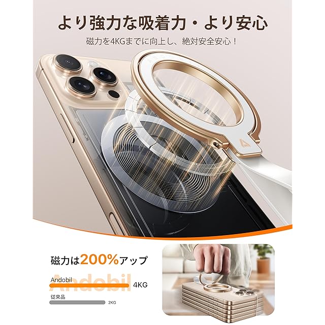 【吸着力4KG・より強力な磁力、より高い安心感】スマホの安全性もAndobilが重視しています。Andobilのプロダクトマネージャーは、磁力をより強化することで、お客様が使用する際の安心感を向上させることを考えました。数百回の実験の結果、この小型のマグセーフ リングに4kgの磁力を実現しました。まず、MagStand Proでは磁石の中でも最も強力な「N56ネオジム」を使用しています。さらに、製品内部の磁石の配置を最適化し、この小さなスマホリングに最大24個の磁石を収めることに成功しました。最後に、製品の背面にはシリコンを追加し、摩擦力と吸着力を強化するだけでなく、リングを使用する際にスマホが傷つけられる心配がないため、快適にご利用いただけます。また、MagSafe対応のケースであれば、iPhone 17/16/15/14/13/12シリーズでもケースをつけたまま使用できます。