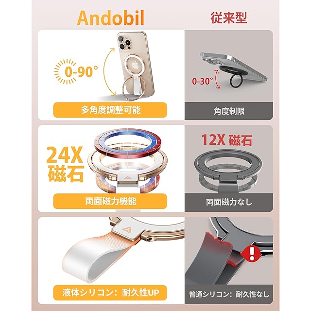 AndobilのMagStand Proは、以下の卓越した特徴を備えたスマホリングです。 ①.多角度調整:MagStand Proは無段階で角度を調節可能で、快適な視聴や操作ができます。②.頑丈な構造:高品質な構造で作られており、スマホを安定して保持し、長時間の使用にも耐えます。③.強力な磁力:強力な磁力でスマホを固定し、落下や滑り落ちのリスクを軽減します。④.使いやすいデザイン:取り付けが簡単で使いやすく、コンパクトなサイズで携帯に便利です。⑤.両面磁石機能:MagStand Proは両面磁石機能を備えており、磁力のあるものに貼り付けるだけで使用可能です。これらの特徴により、スマホの安定性と利便性が向上し、快適な使用体験を提供します。