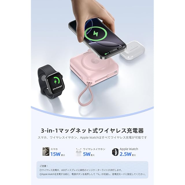 【3-in-1!マッグネット式ワイヤレス充電器】 スマホ、ワイヤレスイヤホンとアップルウォッチはすべてワイヤレス充電が可能です。MagSafe機能と互換性があり、2.5W/5W/7.5W/10W/15Wのワイヤレス充電に対応され、iOSデバイスにより良い磁気ワイヤレス充電体験を提供します。iPhoneを置くだけでワイヤレス充電が開始されます。低電力のワイヤレスイヤホン(5W)やApple Watch(2.5W)をワイヤレス充電前に、電源ボタンを長押しして「%」が点滅し、低電流モードに設定してください。※最高のマグネット効果を確保するために、ケースなし、またはマグセーフケースを使用して充電することをお勧めします。