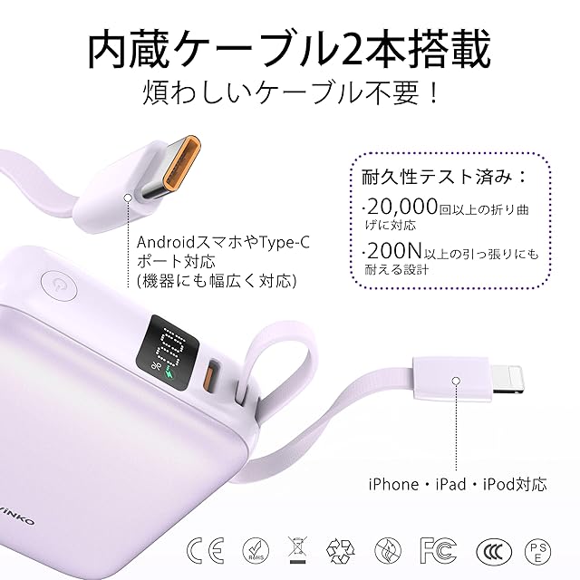 商品名:VINKO モバイルバッテリー 軽量 小型 10000mAh 3c認証 ccc 大容量 -スマホバッテリー 急速充電 Lightning type-c ケーブル内蔵 -携帯充電器 PD 22.5W 3台同時充電 スマホ 持ち運び iPhone 17/16/15 Android iPad 各種機器対応 コンパクト&軽量 機内持ち込み可能 旅行/出張/アウトドア/停電対策/防災 PSE認証済 (紫)