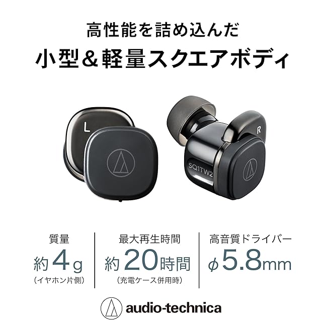 オーディオテクニカ ATH-SQ1TW2 BK ワイヤレスイヤホン bluetooth/小型 軽量 / 最大20時間再生 / 低遅延/外音取込み/マルチポイント/マルチペアリング/防水 IPX5 / ワイヤレス充電 /【国内正規品】ブラック ATH-SQ1TW2 BK