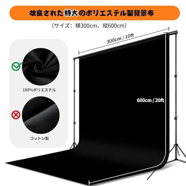 商品名:FotoFoto 背景布 黒幕 (3m x 6m) ブランド:FotoFoto サイズ:広さ3m、長さ6m 材質:ポリエステル製 重量:約2.2㎏ 特徴: 1、ポリエステル材質を採用しており、綿製よりシワが目立たなく、低温アイロンでシワを簡単に取れます。 2、両面設計により、表面はピーチスキン加工で、少し起毛感があり、写真をより上品的に撮影できます。裏面は滑らかで、別の撮影ニーズに満足して両用できて、非常に使用便利です。 3、汚れる場合、手でも洗濯機でも洗濯して干すことができます。 4、パイプ差し込み設計で、直接に背景スタンドのポールを背景布に差し込むだけで、設置できます。 5、一体成型で継ぎ目がなく、製品撮影 / ポートレート写真撮影 / プロの写真スタジオ撮影に適するほかに、結婚式 / ベビーシャワー / パーティーの装飾 / 誕生日 / youtube 動画の撮影に使用可能です。 パッケージ内容: 1x背景布 黒幕 (3m x 6m)