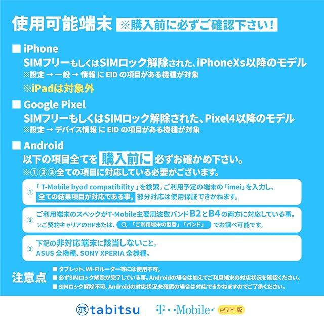 こちらの商品は物理SIMカードを使用しない esim 商品になります。【SIMカードは商品に含まれません。】esim非対応の機種をお持ちのお客様は弊社の物理SIM版T-Mobile商品をお求めください。