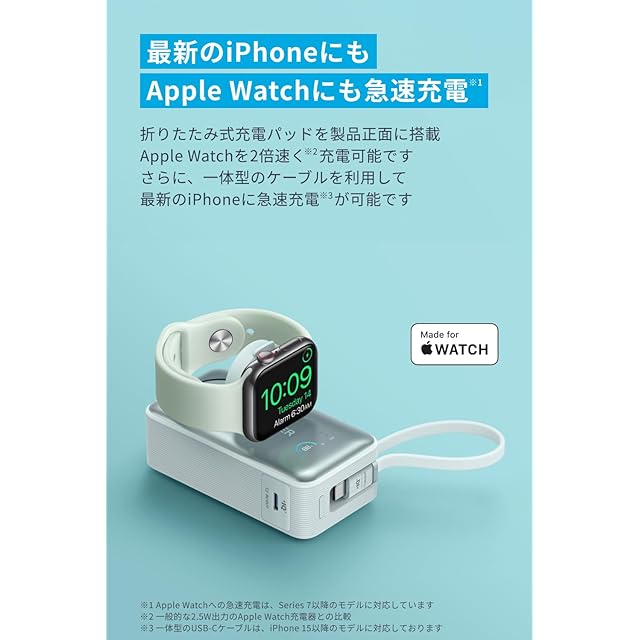 最新のiPhoneにもApple Watchにも急速充電:折りたたみ式充電パッドを製品正面に搭載。Apple Watchを2倍速く充電可能です。さらに、一体型のケーブルを利用して最新のiPhoneに急速充電が可能です。※一般的な2.5W出力のApple Watch充電器との比較