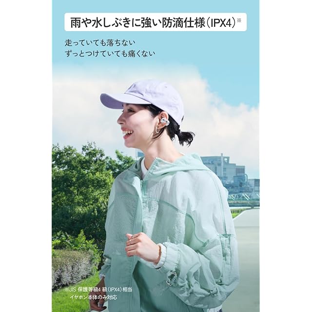 【雨や水しぶきに強い防滴仕様(IPX4)※】 日常生活の中での様々なシーン、天候急変時やエクササイズやジョギング、移動中など、雨や水しぶきが飛んでも使用可能なIPX4相当の防滴仕様を備えています。※JIS 保護等級4 級(IPX4)相当。イヤホン本体のみ対応。