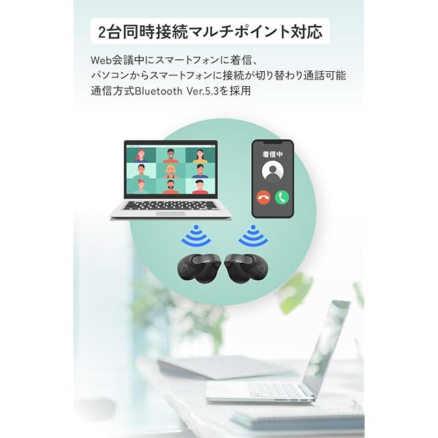 【2台の機器を同時接続できるマルチポイントに対応】 PCとスマートフォンなどの2台の機器に同時接続/待ち受けが可能なマルチポイントに対応。PCによるオンライン会議中にスマートフォンで着信・通話をする、通勤時にスマートフォンで音楽を再生する、出社後にPCでオンライン会議をするといった際、Bluetooth接続の切り替え操作なしで使用できます。