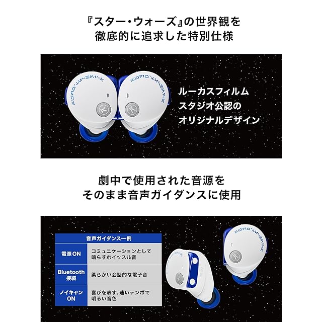 技適マーク認証済み商品(周波数帯:2.4G帯)『スター・ウォーズ』の世界観を徹底的に追及した特別仕様:今回のコラボレーションにあたり、ルーカスフィルムスタジオから特別にデザイン監修を受けて開発された公認プロダクトです。製品細部まで徹底的にこだわり抜き、『スター・ウォーズ』の世界観を再現しました。劇中で使用されている本物のオリジナルサウンドをそのままイヤホンの音声ガイダンスとして収録。起動時をはじめ、あらゆる場面で各モデルのキャラクターに関連するサウンドが楽しめます。