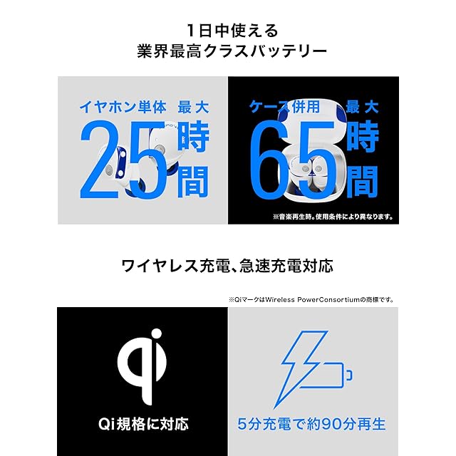 1日中使える、業界最高クラスバッテリー:ノイズキャンセリングOFF時では、イヤホンだけで最大25時間の連続再生が可能なため、 電池切れを心配することなく音楽や動画やSNSを1日中楽しむことができます。また、ノイズキャンセリングON時でも最大15時間、充電ケースを併用すれば最大65時間の連続再生が可能です。