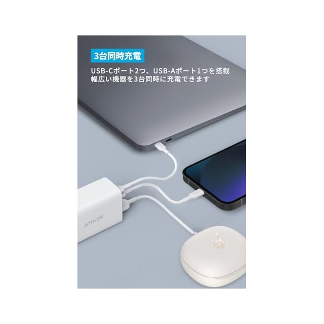 3台同時に充電可能:スマートフォン、タブレット、MacBook、USB PD対応のWindowsノートPCなど、多種多様なデバイスを一度に充電可能。PowerIQ 3.0 (Gen 2) を 搭載した2つのUSB-CポーとAnker独自技術PowerIQ搭載のUSB-Aポートを備えています。3ポート利用時の合計最大出力は64Wと高出力。機器毎に異なる充電器を持ち運ぶ必要はありません。