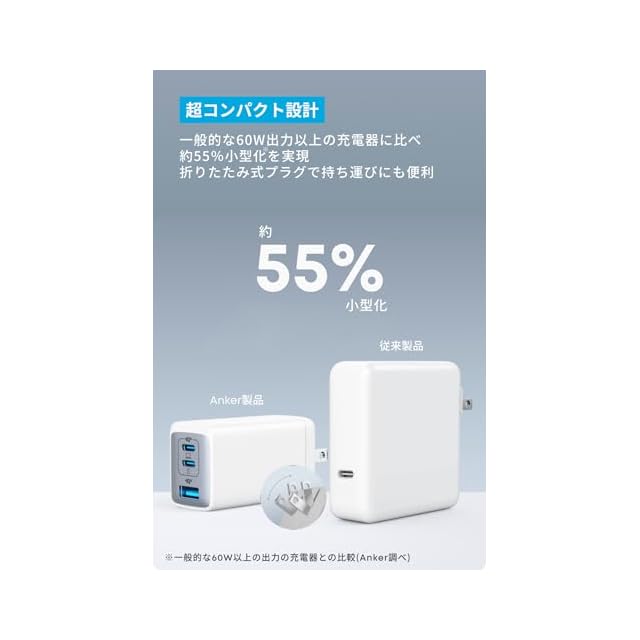 コンパクトで持ち運びやすい:一般的な60W出力以上の充電器と比較して約55%小さいコンパクトサイズ。折りたたみ式プラグを採用しているため、どこへでも気軽に持ち運ぶことができます。