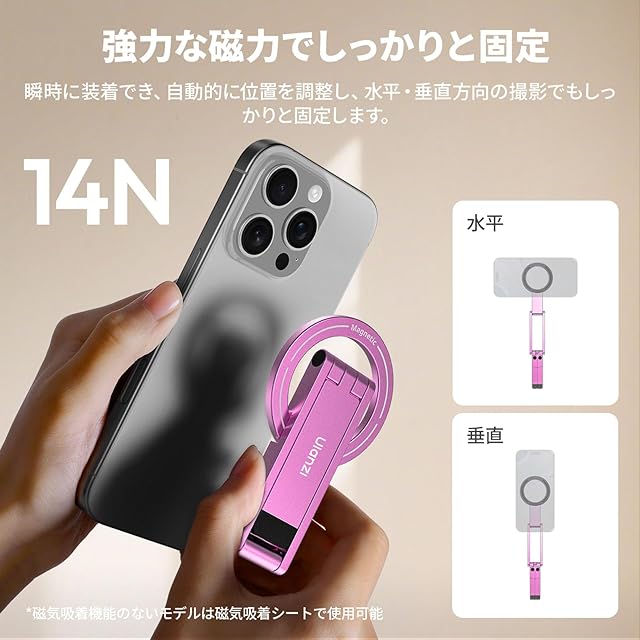 商品名:Ulanzi MA60 スマホ三脚 ミニ三脚 magsafeに対応 自撮り棒 スマホスタンド ミニ携帯スタンド 携帯リング スマホグリップ 薄型軽量 多機能角度調整可能 横置き/縦置き 折りたたみ式 両面マグネット式 アルミ製 持ち運び便利 安定 卓上三脚 セルフィー/生放送/撮影録画/動画鑑賞に最適 Android/iPhoneに対応 ピンク