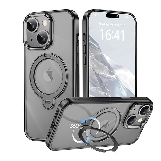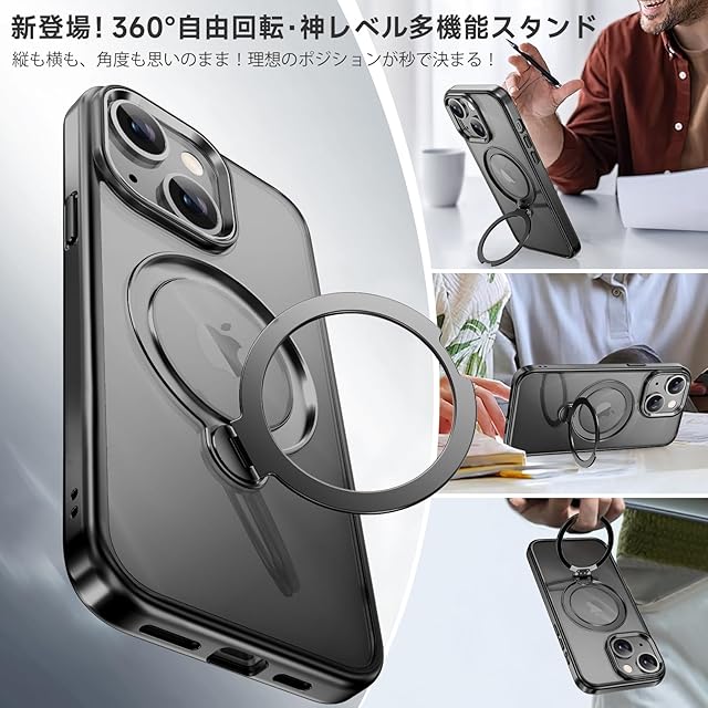 商品名:【透き通る上質感・多機能360°回転スタンド】KMAMBNG iPhone 15 用 ケース Magsafe対応【耐衝撃・金属感・真空メッキ・黄変防止・ストラップホール付き】縦横両立 角度自在 調整可能 磁吸機能でワイヤレス充電対応 おしゃれ スマホケース (ブラック, iPhone 15)