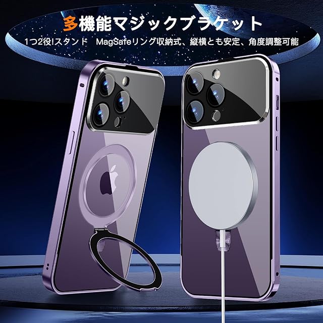 商品名:【スライドカバー磁気ロック・覗き見防止・新次元の一体型カメラ保護 +CD隠しスタンド】MESTRIEV iPhone 14 Pro 用 ケース 全面保護 Magsafe対応 ランヤードホール付き [本体を再現・マット金属フレーム ] 縦横両対応 9H強化ガラス ワイヤレス充電対応 クリア 両面スマホケース 高感度タッチ いphone14Pro 用 ケース 6.1インチ (ディープパープル)