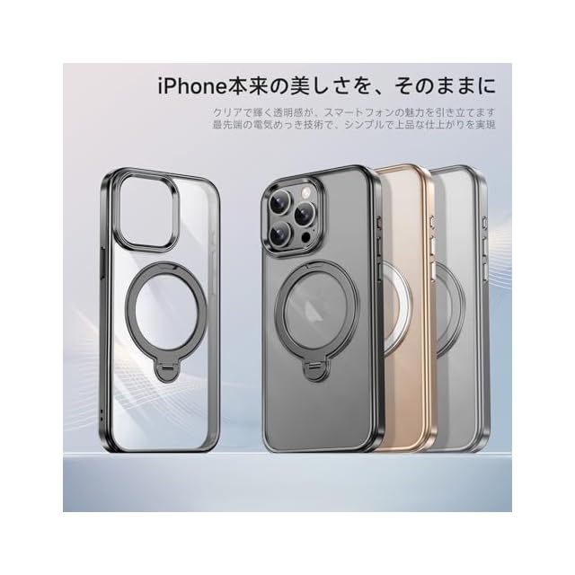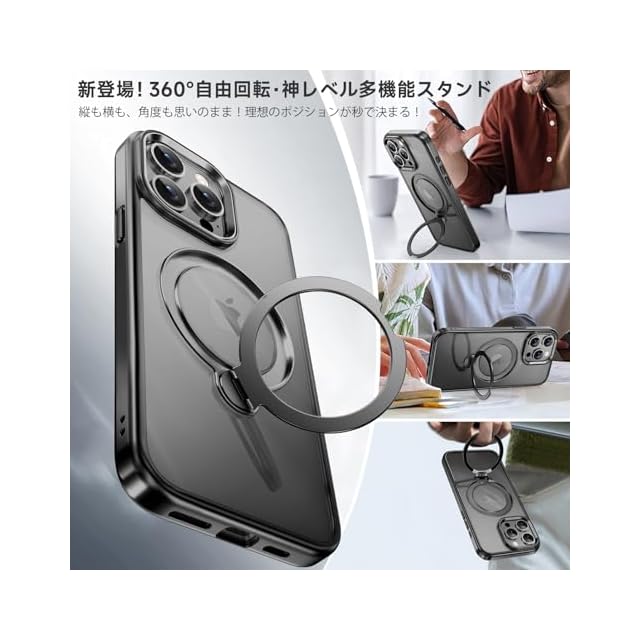 商品名:【透き通る上質感・多機能360°回転スタンド】KMAMBNG iPhone 15 ProMax 用 ケース Magsafe対応【耐衝撃・金属感・真空メッキ・黄変防止・ストラップホール付き】縦横両立 角度自在 調整可能 磁吸機能でワイヤレス充電対応 おしゃれ スマホケース (ブラック, iPhone 15 Pro Max)