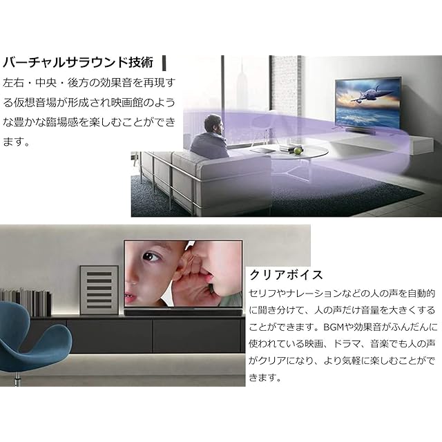 「クリアボイス」や「バスエクステンション」、ヤマハ独自チューニングのサラウンド技術によりテレビの音を聴きやすくグレードアップし、サイズを超えた豊かな低音と臨場感を再現