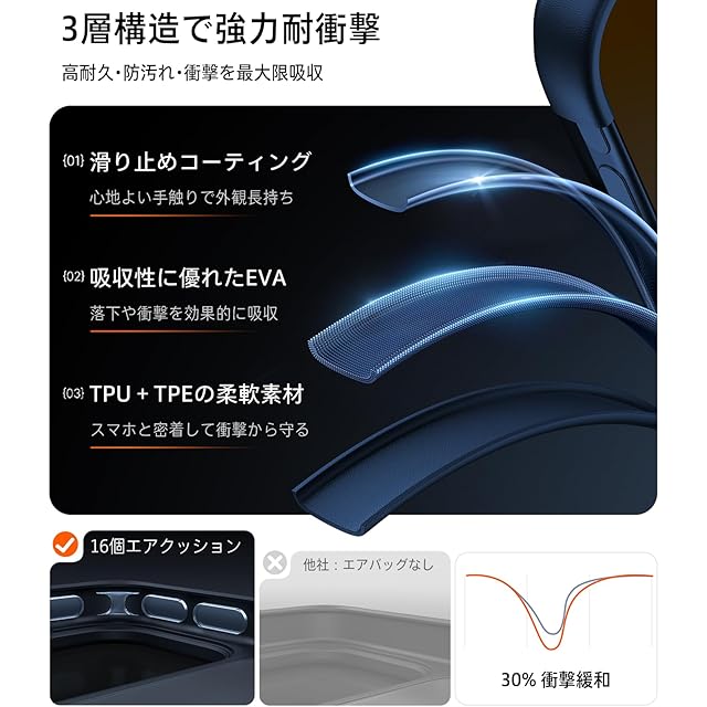 【米軍MIL規格、360°全方位保護】注意:ワイヤレス充電可能、Magsafe非対応!対応機種:For iPhone 17 Pro Max ケース (6.9インチ) 3倍米軍MIL規格防護。米軍MIL認証番号:GZIN2305001346PLO3 「Guardian Series」は7年間の進化で、落下防止と保護力にこだわったTORRASの保護シリーズである。TORRASラボで3.66mの高さから26方向で4,000回以上の落下テストをクリアし、完全無傷を実現する!ケースの四隅にはX-SHOCKエアバッグ構造を採用しており、四辺には360°ランニングトラック型のエアクッション構造を設計。全方向・死角なしでスマートフォンを保護できる。