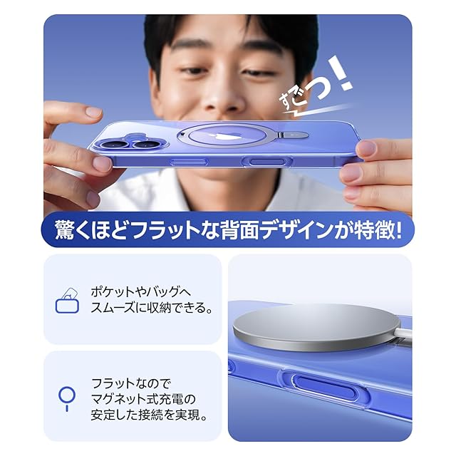 【裸機のような薄型の手触り!】従来モデルより約0.4mm薄型化、まるで裸のスマホのような握り心地、持ちやすさが2倍に向上!超薄型設計で、奇跡の薄さをもたらし、iphone 16の美しいボディラインをそのまま体感!手に馴染む究極の薄さが、スマホライフをさらに快適にする。薄型設計で、ポケットへの出し入れもスムーズ。薄型設計しながらも、角やレンズ周りは補強され、衝撃からもしっかり保護する。3000回以上のワイヤレス充電テストをクリア。薄型設計により、スマホ本体と充電器の距離が近く、他のスタンドケースと比べて充電効率が優れている!