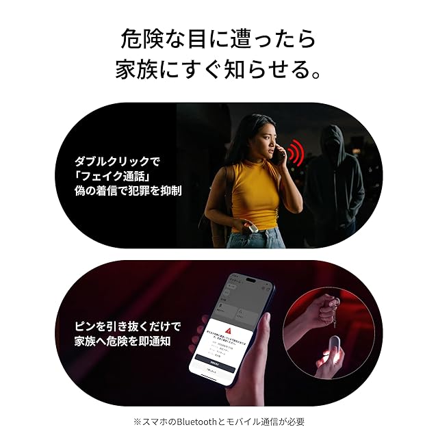 【さりげなく身を守る手段としてフェイク通話や家族への通報】 「誰かにつけられてるかも……」と不安になった時、まずはフェイク通話で様子見。防犯ブザーのボタンをダブルクリックすると、「誰かから電話がかかってきたように見せかける」ことができます。マナーモードでもしっかり着信音が鳴り、犯罪抑止効果に。また、危険に遭遇した時は、防犯ブザーを作動させると、スマホ(Bluetoothとモバイルデータ通信がONになっている必要あり)から、予め指定した緊急連絡先へ通知を送信し、危険を知らせます。