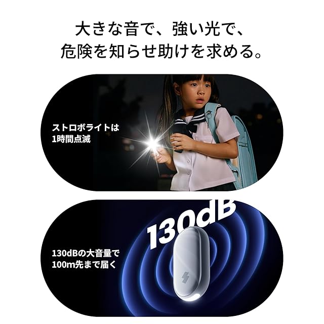 【大音量防犯ベル×「探す」アプリで子どもの安全を守る】 いざという時は、「探す」アプリから、子どもの「今どこ?」「危ない!」がすぐ分かります。不審者に遭遇したら、迷わずピンを抜きましょう。130dB(100m先まで聞こえるレベル)の大音量でブザーが鳴り、警報ライトが高速で点滅します。周りの大人に危険を知らせて、犯人を撃退しましょう。また、Appleの「探す」から、日本全国どこでも、お子さまの携帯品の位置をいつでも確認することができます。