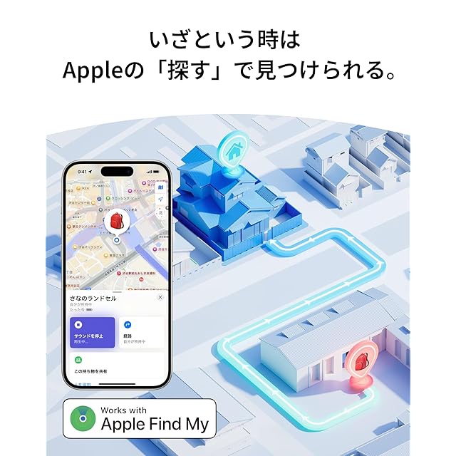【大音量防犯ベル×「探す」アプリで子どもの安全を守る】 いざという時は、「探す」アプリから、子どもの「今どこ?」「危ない!」がすぐ分かります。不審者に遭遇したら、迷わずピンを抜きましょう。130dB(100m先まで聞こえるレベル)の大音量でブザーが鳴り、警報ライトが高速で点滅します。周りの大人に危険を知らせて、犯人を撃退しましょう。また、Appleの「探す」から、日本全国どこでも、お子さまの携帯品の位置をいつでも確認することができます。