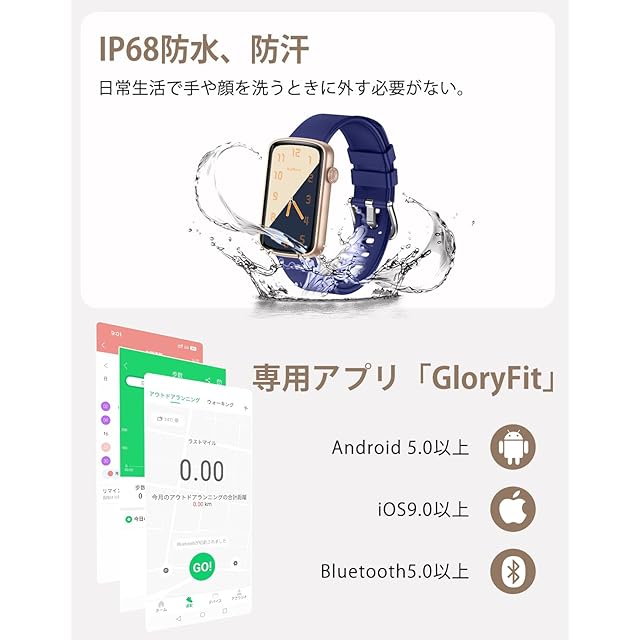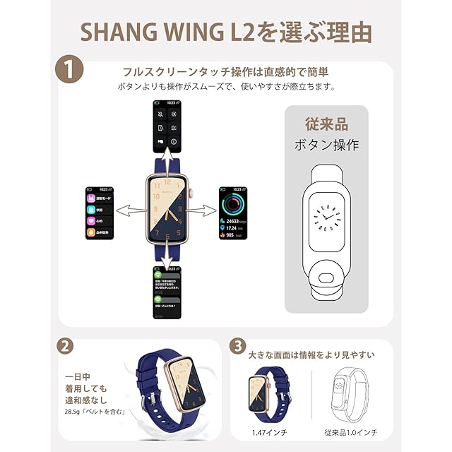 「1.47インチ·超軽量·使いやすい」スマートウォッチL2は、1.47インチの長方形のスクリーンを搭載し、解像度は170×320で、文字がクリアで読みやすくなっています。男女兼用で、バンドを含めた重量はわずか28.5gで、一日中付けていても違和感を感じません。タッチスクリーン操作で、アプリ「GloryFit」に接続すれば、簡単に使うことができます。また、このスマートウォッチは、多様なシーンで活躍できます。スポーツ時には運動データを記録し、日常生活管理に役立ちます。ビジネス時には、通知を受け取ったり、スケジュールを管理したりすることができます。さらに、レジャー時には、音楽コントロールや写真撮影のリモート操作が可能です。このように、様々な場面で活用できるスマートウォッチです。