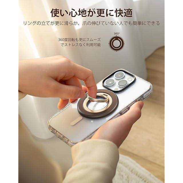 【究極の使用感さすがPro】スマホリングをもっと楽しく利用することを目指し、AndobilはようやくMagRing Proの開発に成功できました只今、MagRing Proの特徴を一部分紹介します最強のヒンジ部-スタンド機能「緩い」と「ガラガラ」などの問題一気に解消します当社のMagRing Proは当社独自技術のダンパーヒンジ採用して、200000回以上360回転と上げ下げテストをクリアし、経年劣化によるスタンド機能「緩い」問題を解決できた②更に使いやすい-「力」のバランスを整え、安定感を確保した共に、市販の製品よりリングの立てが更に滑らか、マニキュアしたや爪が伸びていない人でも、簡単にリングを立てる③史上最薄型-商品の厚さは3㎜で、重さが25gまで史上最薄型に改良成功、スマホに付けても全然違和感ないまた、ダブルRingの構造で、内側のパーツだけ回るので、スマホ本体に傷が付くことがなく、スマホを卓上に水平に置いてもスマホのレンズにぶつからなく安心してご利用いただけます簡単な商品ですが、限界ギリギリまで最善を尽くすことが大切です