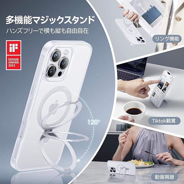 【スゴすぎる!多機能スタンド】弊社のMagicStandシリーズは、タテヨコどちらもOKのスタンド機能とリング機能とMagsafe充電対応も追加。品質、機能性、デザイン性の全てを高い基準で満たす、シーンや性別を選ばないケース。スタンドとして使用すると、画面が見やすい角度で固定でき、動画鑑賞やテレビ電話などが自然で快適に行えます。また高品質な材料と特許な技術が採用され、30,000回の開閉テストをクリアし、リングの部分緩みを一気に解消!従来品に比べて約10倍の長寿命化になり、圧倒的な耐久性と強度を実現されます。材質・形状・加工に徹底的にこだわり、スマホを快適に操作するように仕上げます。