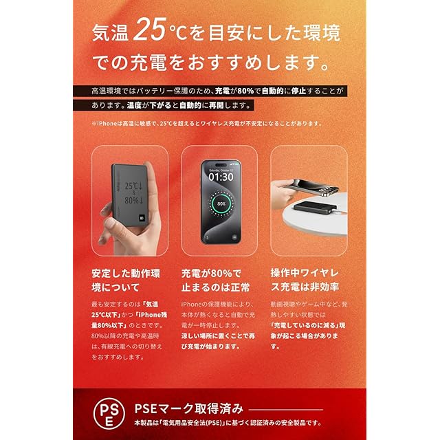 【Qi2搭載で充電速度2倍】新たな充電規格WPC Qi2に対応しました。従来の7.5W(Qi1)から充電スピードが2倍15WでiPhoneを充電することができます。また、Androidの場合は、マグネット吸着にも対応し、ぴたっと、くっついて素早く充電することができます。
