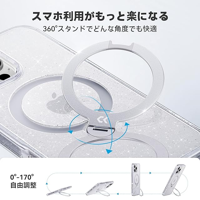 商品名:【透き通る上質感・定点360°回転】CASEKOO iPhone 16 Pro Max 用ケース キラキラ クリア 米軍規格保護 フィット感 MagSafe対応 最大25W急速充電対応 横縦両立 角度自在 超強磁力 耐衝撃 高耐久性 ラップホール付き 透明 黄変防止 いphone16promax 用ケース 6.9インチ「MagicStand Pro Glitter」(ラメ入りクリア)