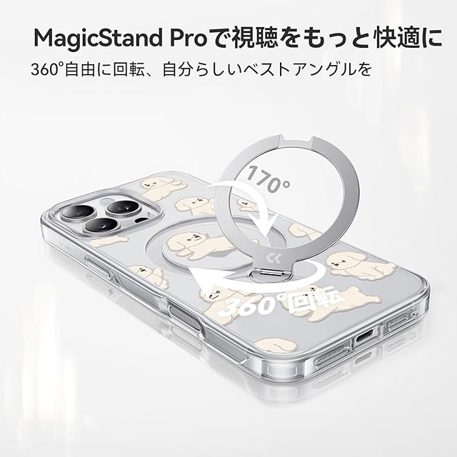商品名:【最新トレンド・360°回転スタンド】CASEKOO iPhone 16 Pro 用ケース クリア 比熊犬 ふわふわ 米軍MIL規格 フィット感 MagSafe対応 最大25W急速充電対応 横縦両立 角度自在 超強磁力 耐衝撃 高耐久性 ラップホール付き 透明 黄変防止 いphone16pro ケース 6.3インチ「XLine MagicStand Pro」(クリア)