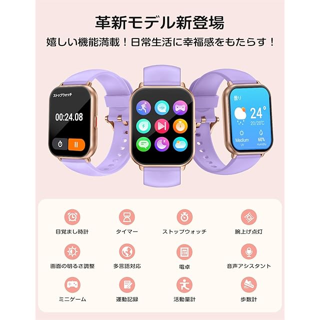 【実用な機能満載&IP68防水】 毎日の歩数や距離、記録するだけでなく、座りがち注意、リラックス機能も備えています。女性の月経周期の記録と通知機能も揃えます。スタイリッシュなデザインは職場や生活の中でレディースもメンズも使用いただけます。スマホ探す、リモコン撮影 、アラーム、タイマー、ストップウォッチ、腕上げ点灯、画面の明るさ調整、おやすみモード、天気予報、懐中電灯、音楽コントロール、多言語対応などの便利機能が満載!IP68規格の防水・防塵性能を持ち、日常生活での手洗いや洗顔の際に取り外す必要がありません。注意:ダイビングや海水浴、サウナでの使用は避けてください。