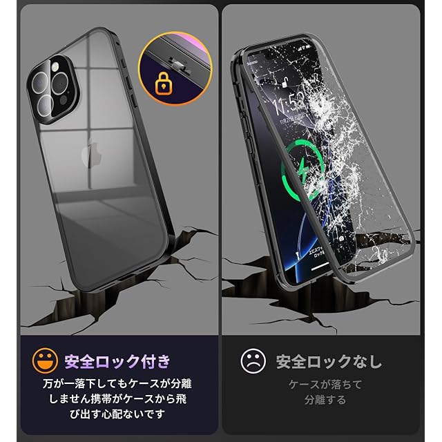 【両面9H強化ガラス・高感度タッチ】このiPhone16 Pro ケースは、9H硬度ガラス素材を採用されて、鍵やカッターなどの鋭利なもので切りつけてもキズが付きにくく、耐衝撃性と耐傷性に優れています。両面9H強化ガラス + ロック機能付きメタルフレームの組み合わせにより、落下保護が向上し、iPhone16 Proを全方位からしっかりと守れます。前カバーの画面、3Dタッチ機能により、応答性能が優れています。特殊コーティング技術でスムースな指すべりで操作性アップでゲームをしても楽しめます。注意:画面保護フィルムを貼ってる必要はありません、操作反応が低下します。